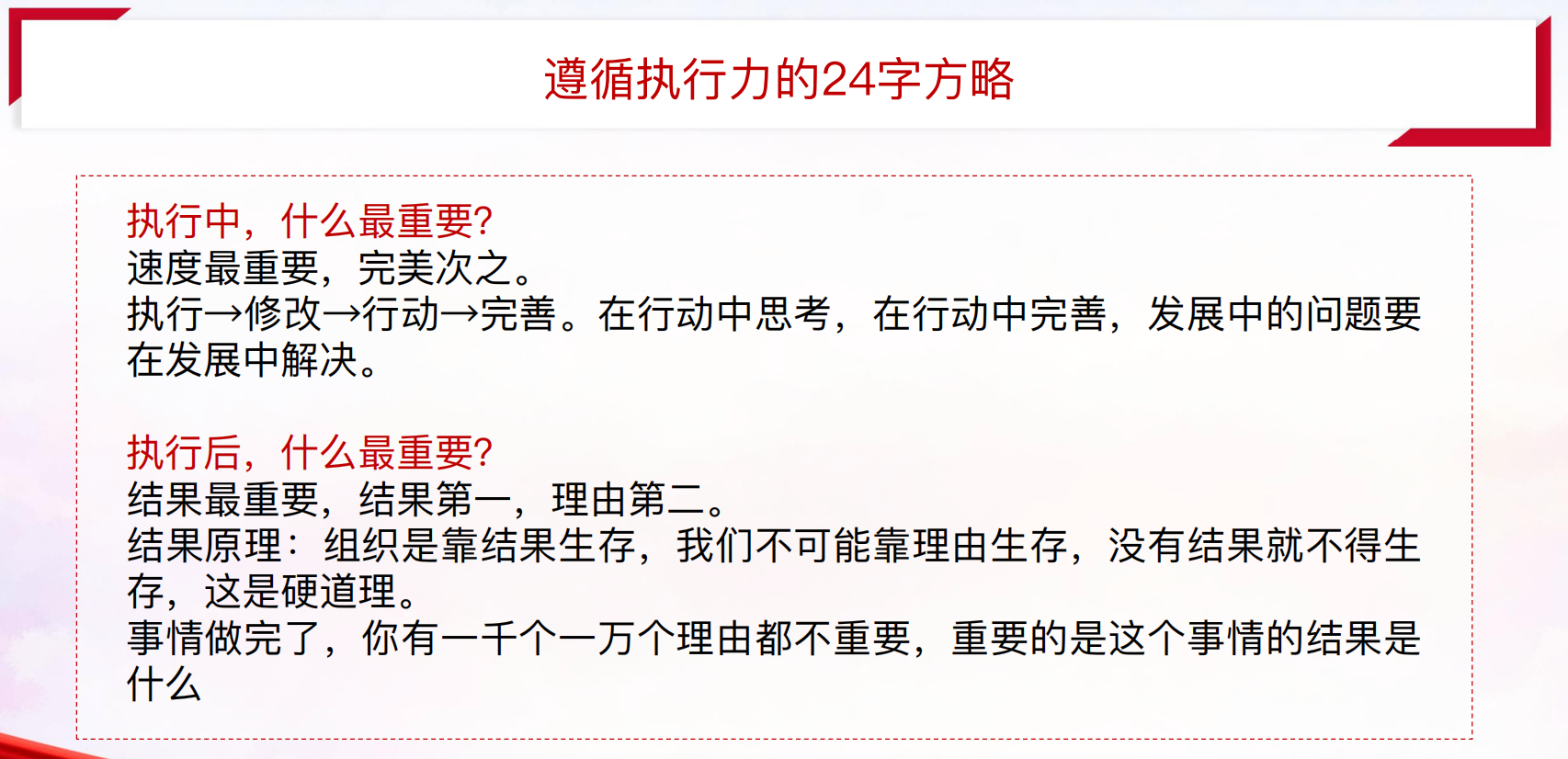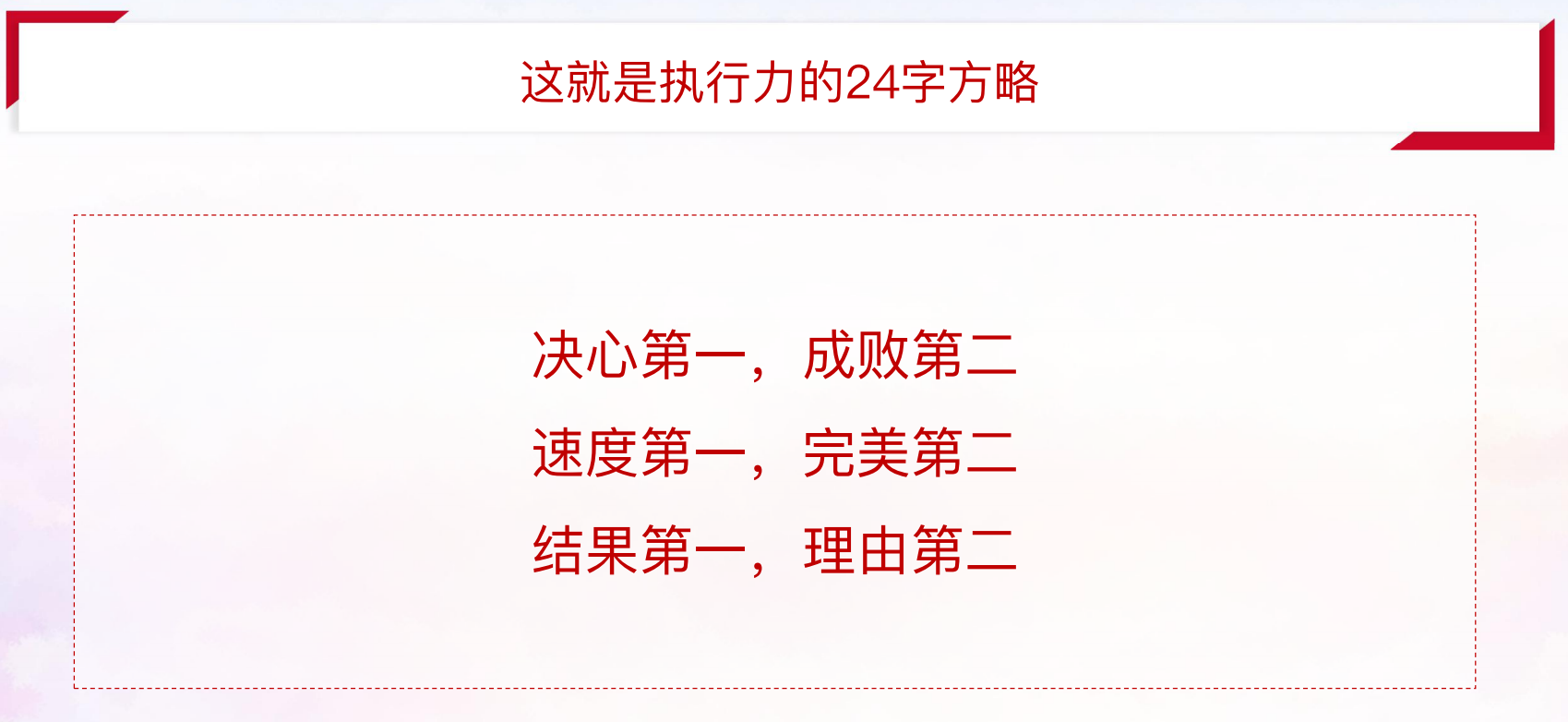 中国共产党一直以来对抓落实、强执行的极端重要性都有过很多精辟的论述,邓小平同志指出:“少说空话、多干实事”;江泽民同志指出:“落实,落实,再落实,因为这是做好一切工作的关键环节”;习近平同志指出:“改革监图有了,现在的关键是把监图一步步变为现实。”如果不能沉下心来抓落实,再好的目标、再好的蓝图,也只是镜中花、水中月。“空谈误国、实干兴邦也正是从历史经验教训中总结出来的一个重要的治国理政结论。《习近平谈治国理政》中指出:“为政之要,贵在落实;落实之要,重在执行。“无论是治国理政还是企业发展,再伟大的梦想、再完美的战略,最终的效果一定体现在落地执行上,没有执行力,一切都归零。
