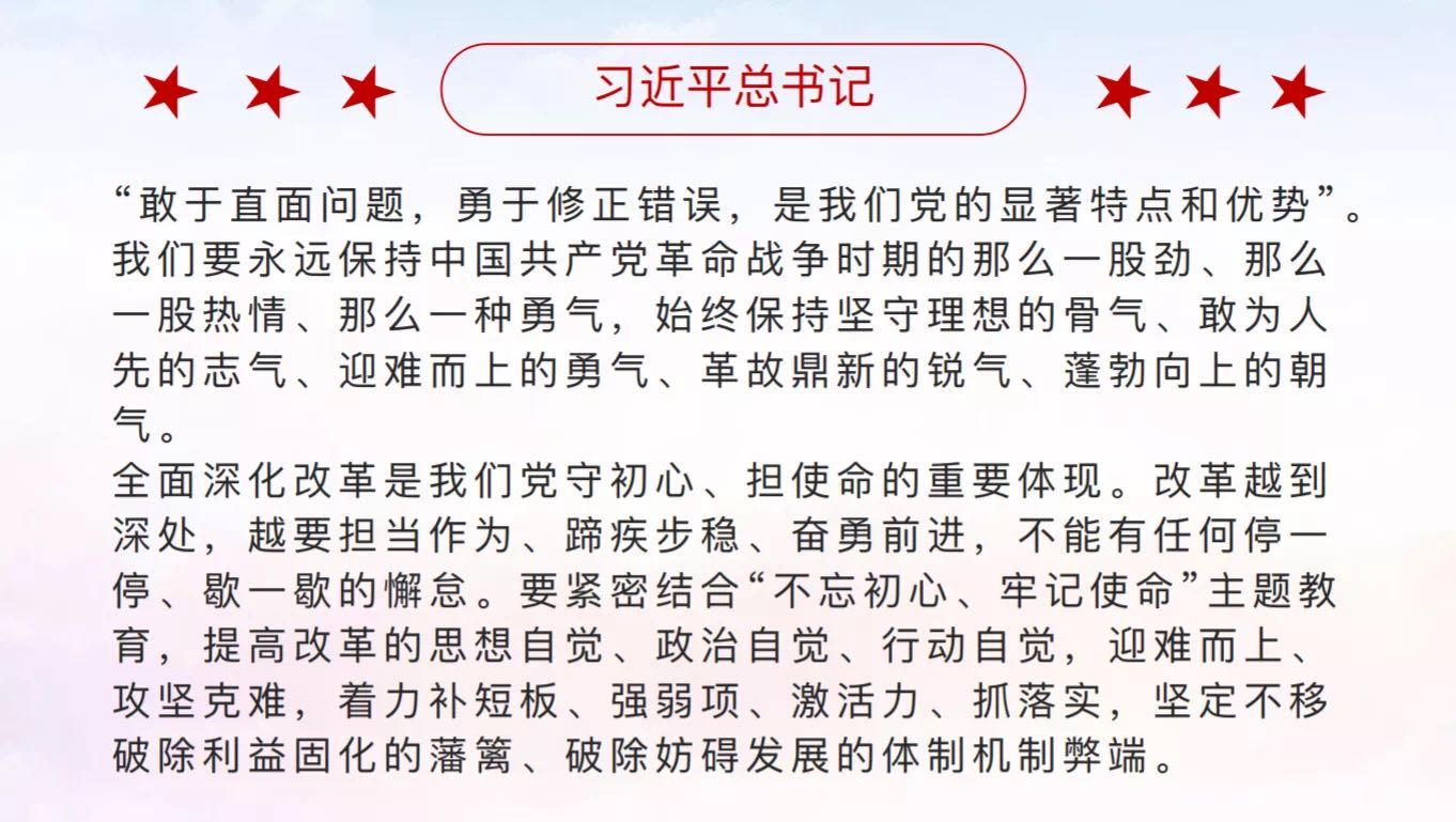 随着改革的深入,改革的复杂性、敏感性、艰巨性会更加突出。我们要认真学习贯彻习近平总书记重要讲话精神,结合“不忘初心、牢记使命”主题教育,在提高改革的思想自觉、政治自觉、行动自觉上下功夫,坚定不移全面深化改革,逢山开路,遇水架桥,敢于向顽瘴痛疾开刀,勇于突破利益固化藩篱,将公司改革不断向纵深推进。
