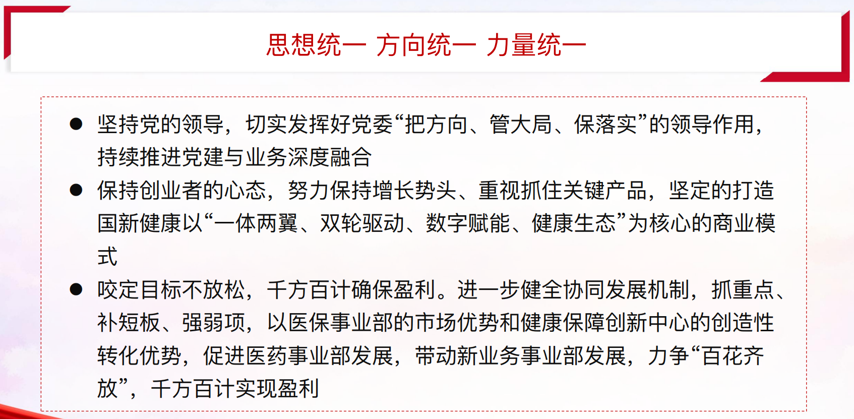 如今,国新健康正面临着难得的历史机遇,也面临着一系列重大困难考验,要想顺利实现我们的伟大理想,必须要有面对问题、挑战,敢于斗争的思维、意识,必须要有这种昂扬向上、不断进取的心理状态,不断点燃干事创业的激情、坚定不移地深七改革、激发团队战斗力、增强队伍执行力。接下来,围绕这几方面分享一些我的认识,与大家共勉。