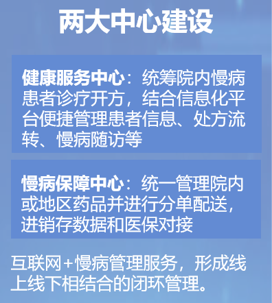 贯彻“大卫生、大健康”理念,打造“就医全流程、服务一体化”的慢病管理中心,承载辖区内慢病患者的就医购药、随访管理、健康宣教等全流程的服务,通过数字化手段赋能医疗机构,提升服务效率和老百姓满意度与获得感。