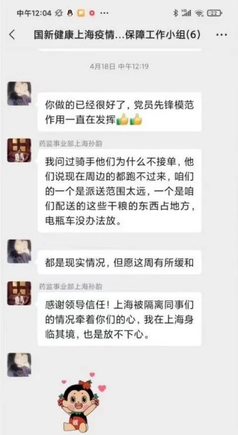 国新健康医药事业部孙韵家住上海浦西,封控期间,她主动提出担当副楼长,配合小区疫情防控工作。孙韵还负责国新健康在上海的物资保障工作,她细致地询问和整理了其他员工的隔离地点和物资需求,多方协调配送资源,克服隔离点分散、浦东浦西物流不通、物流配送运力严重匮乏等困难,将物资送到需要帮助的同事手中,为上海的小伙伴们架起了一座由北京连通至上海的疫情物资保障桥梁。她说,“我没有想那么多,在疫情大考当前,作为一名党员就应冲在前面”。