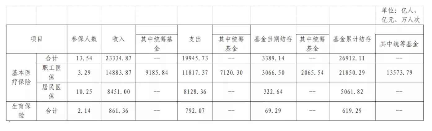全年职工基本医疗保险基金收入14883.87亿元,同比增长9.94%,其中统筹基金收入9185.84亿元;基金支出11817.37亿元,同比增长10.37%,其中统筹基金支出7120.30亿元;年末累计结存21850.29亿元,其中统筹基金累计结存13573.79亿元,个人账户累计结存[2]8276.50亿元。