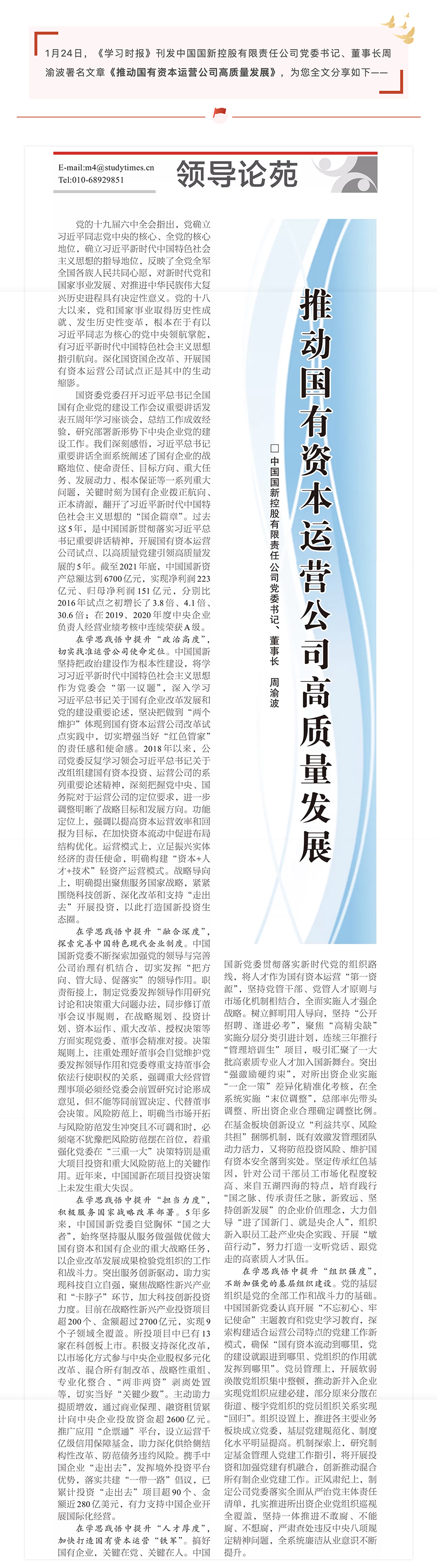 《学习时报》刊发中国国新党委书记、董事长周渝波文章:推动国有资本运营公司高质量发展
