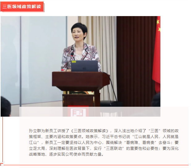 在中国共产党百年华诞之际,公司迎来了2021年首批员工入职。新员工新活力,是企业发展的新力量,公司领导班子高度重视。公司于7月21日-24日期间组织了“新辰计划”第一期新员工成长营活动。国新健康党委副书记、总经理李永华,国新健康党委委员、副总经理、国新健康研究院院长孙立群出席成长营并授课,相关职能部门和事业部负责人参加了此次活动并任新员工导师。