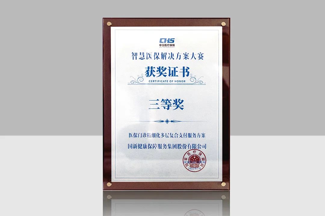 基于前期探索与实践,国新健康推出医保门诊精细化多层复合支付服务方案,入选由国家医保局主办的智慧医保解决方案大赛决赛,最终作为支付领域唯一入围的方案荣获全国三等奖。该方案获得了国家相关部门和行业专家的认可,并鼓励国新健康再接再厉,发挥第三方专业能力和技术优势,基于落地实施基础,尽快形成一套可复制、可推广的经验。