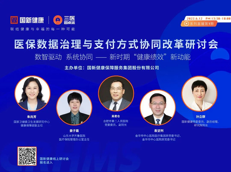 国新健康诚邀国家卫健委卫生发展研究中心健康保障部副主任朱兆芳、山东大学齐鲁医院医疗保险管理办公室主任姜子霞、合肥市第二人民医院党委委员、副院长吴君仓、金华市中心医院医疗集团(医学中心)原党委书记袁坚列、国新健康党委委员、副总经理、研究院院长孙立群等专家齐聚“国新健康·三医圆桌派”首播。建立有效的多方资源联结,持续探索医疗有质量、医生有动力、运营有数据、管理有抓手的健康保障服务共同体的实践路径。