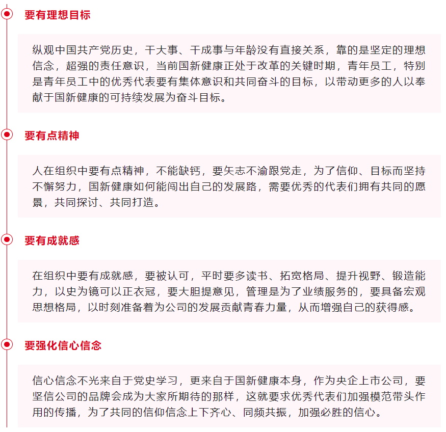 与会青年代表中既有初入国新健康的新生力量,也有工作多年的业务骨干,与会代表依次发言,大家围绕青年员工成长、公司业务发展、攻坚克难经历等不同角度畅谈思想感悟、分享工作学习体会及遇到的困惑问题,共同思考和体会国新健康人的成长和担当,大家集思广益、建言献策,就公司在管理、文化、制度、组织生活等方面提出了很多有利于国新健康发展的意见和建议,既谈到对公司的期待,也纷纷表示要立足岗位、主动担当,为国新健康高质量发展贡献青春力量,大家发言踊跃、语言朴实、态度诚恳,反映了国新健康青年员工勇于奋斗、勤于思考的精神状态。