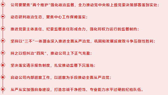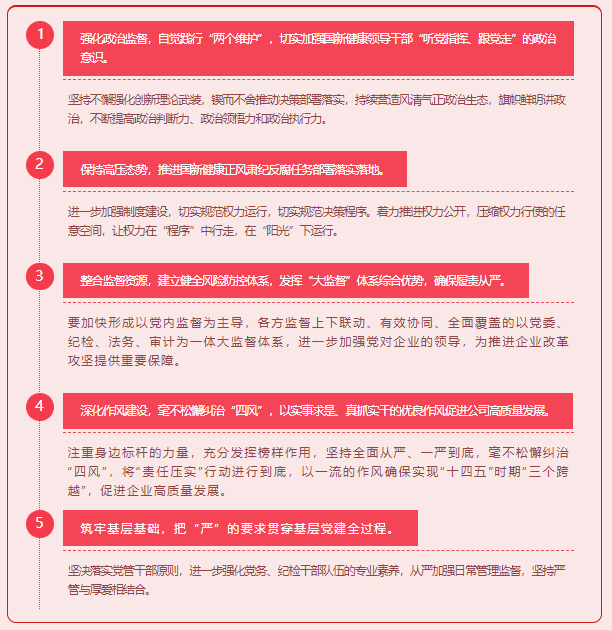 袁洪泉强调,国新健康纪委2021年以习近平新时代中国特色社会主义思想为指导,全面贯彻党的十九大和十九届二中、三中、四中、五中全会精神,深入学习贯彻十九届中央纪委五次全会精神,结合2021年全国两会核心要点,全面落实国资委和中国国新党风廉政建设和反腐败工作会议部署,增强“四个意识”、坚定“四个自信”、做到“两个维护”,围绕企业中心任务,发挥监督保障执行、促进完善发展作用,一体推进不敢腐、不能腐、不想腐,深化纪检监察体制改革,扎实推进规范化法治化和干部队伍建设,为公司改革发展提供坚强保障,推动逆向混改央企上市公司党的建设与企业管理深度融合,以优异成绩庆祝建党100周年。