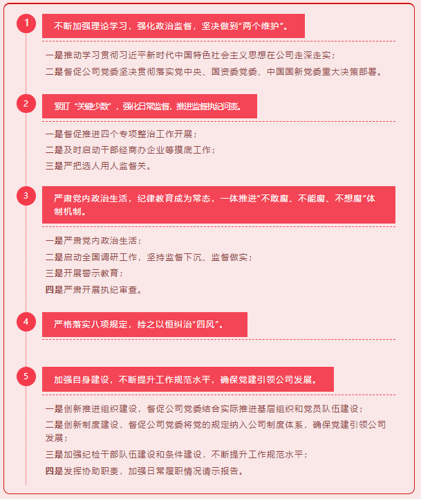 杨殿中指出,公司党委和纪委深入学习贯彻习近平新时代中国特色社会主义思想,围绕公司年度的工作目标、任务,履行全面从严治党“两个责任”,切实加强政治监督,主题教育取得积极成效,同志们在资源少、任务重的情况下,加班加点,完成了很多工作,取得了比较好的成效。旗帜鲜明讲政治,政治意识切实增强; 贯彻落实中国国新决策部署,展现政治担当;持续推进党风建设,企业政治生态愈发变好; 完善基层党组织建设,推动党建与业务深度融合; 以促进业务发展为主线,切实结合实际建起组织队伍,以高质量党建服务中心工作取得实效。