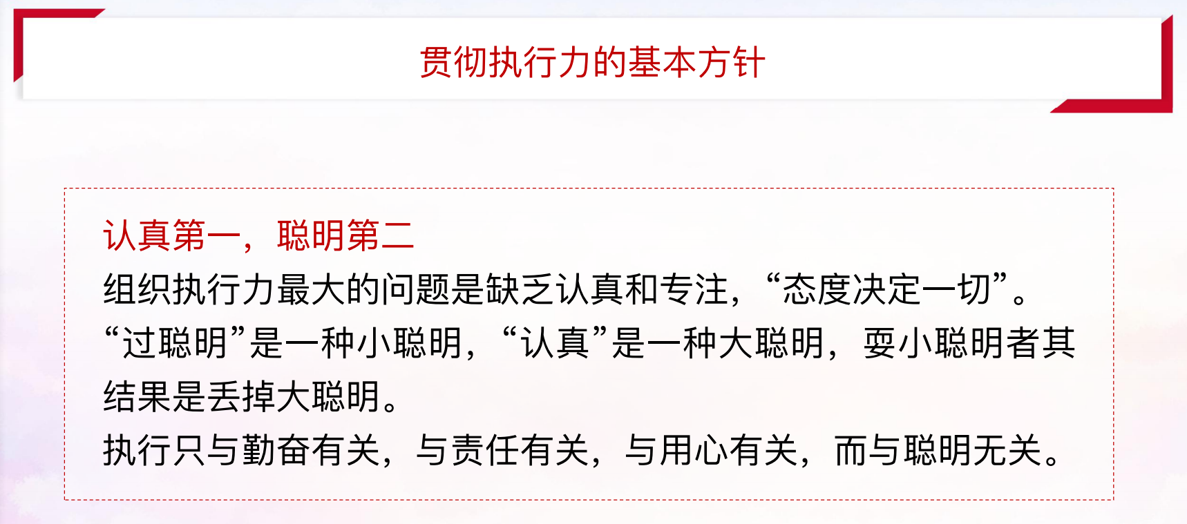 中国共产党一直以来对抓落实、强执行的极端重要性都有过很多精辟的论述,邓小平同志指出:“少说空话、多干实事”;江泽民同志指出:“落实,落实,再落实,因为这是做好一切工作的关键环节”;习近平同志指出:“改革监图有了,现在的关键是把监图一步步变为现实。”如果不能沉下心来抓落实,再好的目标、再好的蓝图,也只是镜中花、水中月。“空谈误国、实干兴邦也正是从历史经验教训中总结出来的一个重要的治国理政结论。《习近平谈治国理政》中指出:“为政之要,贵在落实;落实之要,重在执行。“无论是治国理政还是企业发展,再伟大的梦想、再完美的战略,最终的效果一定体现在落地执行上,没有执行力,一切都归零。