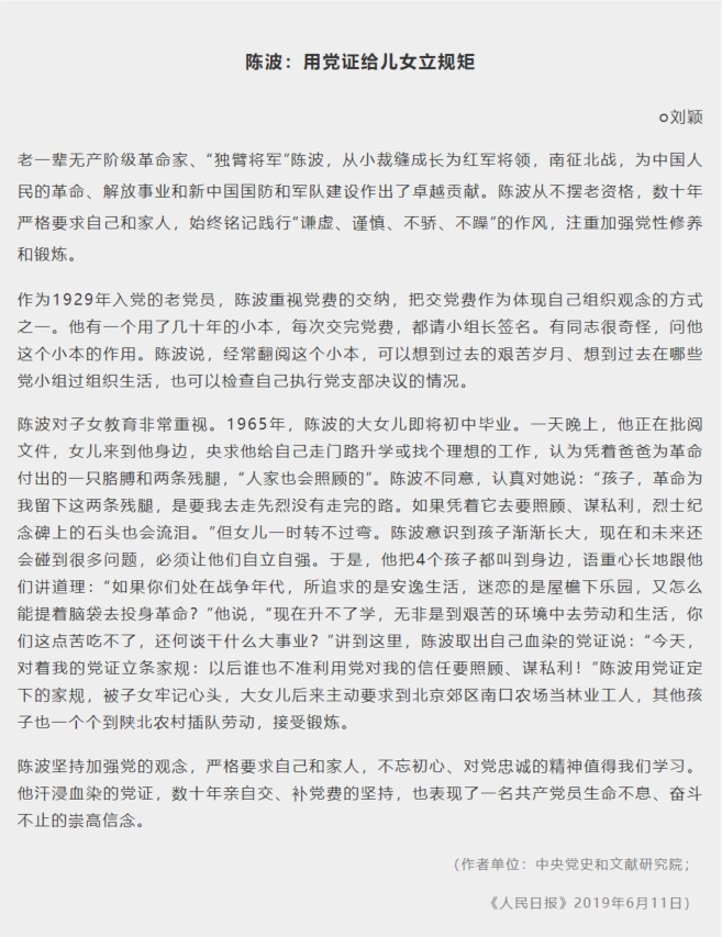 小编按:本期为大家分享的第三十一个党史小故事—陈波:用党证给儿女立规矩。
