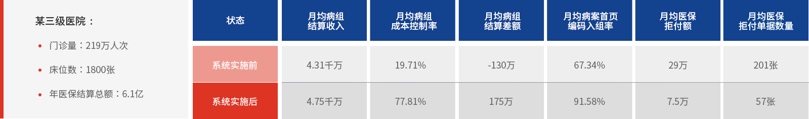 医院大数据医疗运营管控系统是国新健康依托多年医保管理专业服务经验,结合医院医保医疗服务与运营管理存在的痛点及实际需求,为医院用户构建的一套适用于复合付费改革政策条件下实现医院收益、成本、服务、质量的最优均衡的信息化支持工具,通过该系统在医院使用与配套服务,可以有效提升病案首页数据质量,实时动态管控风险医疗行为和在院患者智能分组或病种分值测算以及多维度对病组(种)结算差额与医疗效果进行评价,在保证医疗质量的前提下,合理优化医疗成本,帮助获得良好的经济与社会效益,同时为医院的运营预算管理与全面绩效管理提供必要的数据支持。