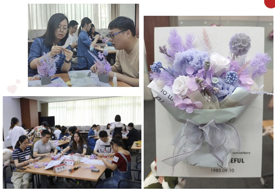 在随后DIY永生花的制作更是将整场活动推向了高潮。永生花也叫保鲜花、生态花,国外又叫“永不凋谢的鲜花”。用心亲手做一束充满芳香气息的干花,通过相互协作,拉近了心与心的距离,更是长久友谊的一种诠释。