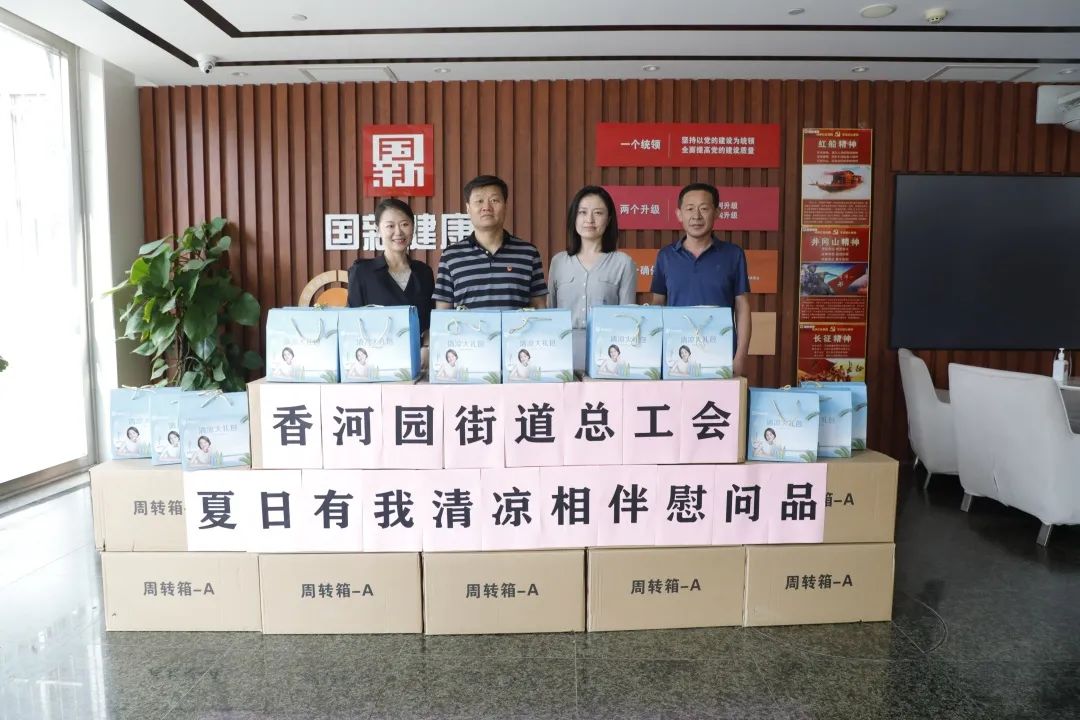 为做好常态化疫情防控形势下的高温作业和高温天气作业劳动保护工作,切实维护广大职工的劳动健康权益,7月21日上午,香河园街道办事处武装部部长堵书山、香河园街道总工会主席于华民一行到访国新健康,开展“夏日有我,清凉相伴”走访慰问活动。随后堵书山一行与国新健康纪委书记袁洪泉进行了亲切会谈,党群工作部副部长胡冬男、综合管理部副总经理李研等相关同志陪同参加会谈。