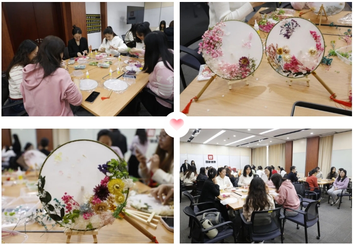 3月7日上午,伴随着和煦的春风和浓浓的暖意,姐妹们聚坐在一起,体会手工制作的魅力,让一朵朵永生花在指尖绽放!活动现场,工作人员向大家介绍了团扇的发展历史,还讲解了制作团扇的基本操作方法,大家发挥创意,在空白的扇面上用永生花摆出各种形状和图形,没多久,一把把高颜值的团扇相继出炉……