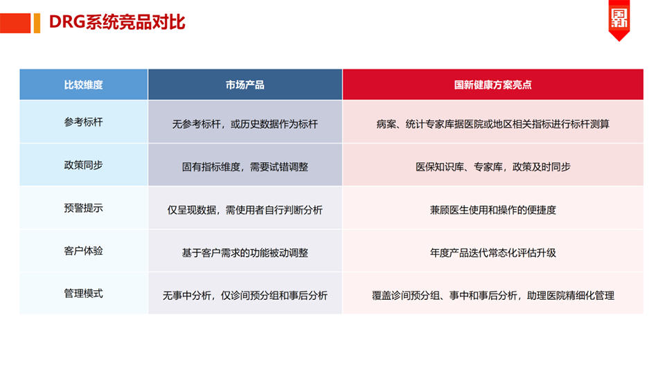 “了解产品优势能够帮助大家在售前宣讲时更快抓住要点,提高实施操作的工作效率。”刘宜茹先从临床医生、病案编码员与管理人员三个角色的关注要点对DRG系统配套流程进行简介,之后从产品的参考标杆、政策同步、预警提示、客户体验及管理模式五个维度与市场产品进行对比,帮助大家了解系统使用流程,知晓国新健康产品方案亮点。