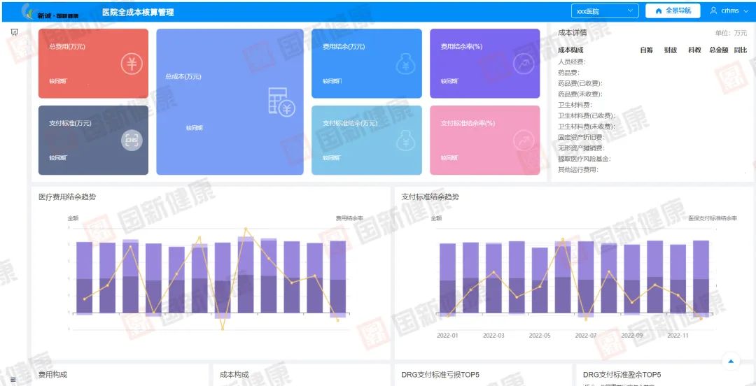 医院全成本核算管理产品是国新健康在新医保支付改革政策触发下,延伸医院DRG/DIP管理应用,从院级成本、科室成本、项目成本向病组成本和病种成本深化,促进临床诊疗规范,与原有医院端质量控制和绩效考核产品体系形成合力,助力医院逐步从“收入增长”转变为“降低成本”,从财务视角转向价值链视角,全面、精准地实现以成本核算为基础的医院精益管理。同时,为医保定价提供重要基础和依据。