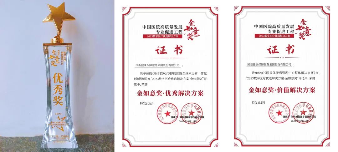 国新健康《基于DRG/DIP的医院全成本运营一体化创新管理》和《医共体慢病管理中心整体解决方案》凭借在完整度、推广度、创新度、价值度等方面的卓越表现,分别获评“金如意奖·优秀解决方案”和“金如意奖·价值解决方案”。国新健康在数字医疗领域的专业能力和技术水平,再次得到行业权威机构和专家的高度认可。