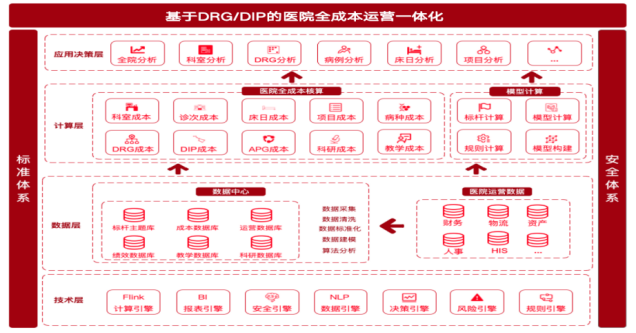 国新健康基于DRG/DIP的医院全成本运营一体化创新管理解决方案,是在支付方式改革背景下,为满足医院高质量发展需求,以精准核算科室全成本、医疗服务项目成本、诊次成本、床日成本、病例成本、医疗组成本、医师成本、DRG/DIP成本对象为基础,为医院提供各核算对象决策分析、数据应用模型、运营成本分析报告等支撑手段,帮助医院搭建能够支撑成本控制、医疗服务定价、绩效评价等业务场景管理平台,实现经济运行结合临床业务事前、事中、事后精益管理的运营体系。