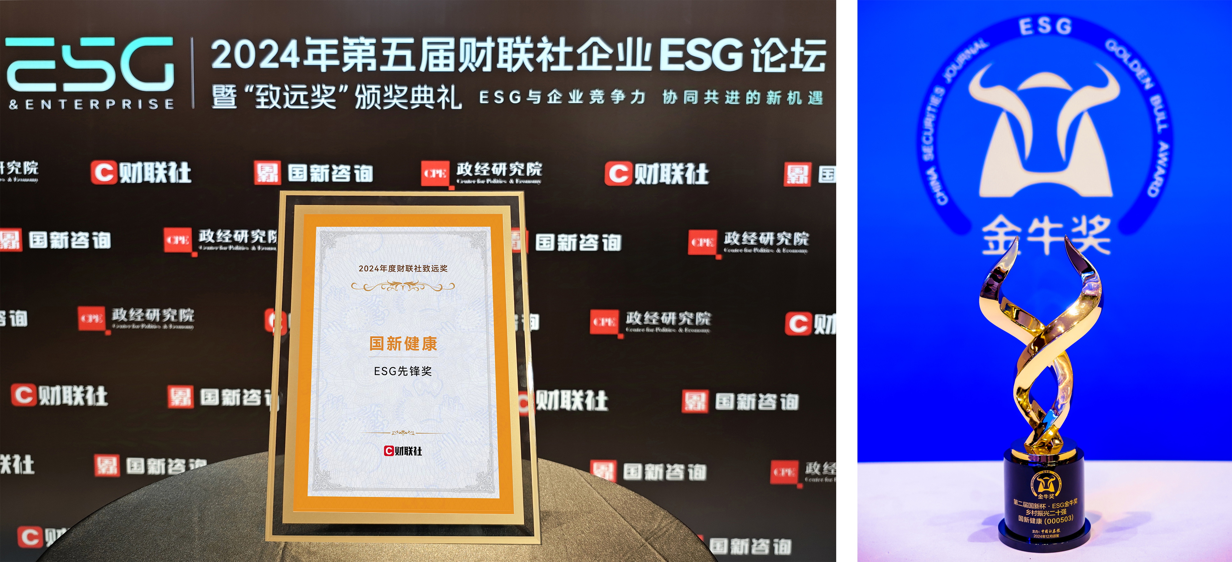 2024年11月29日,2024年第五届财联社企业ESG论坛在北京举行,国新健康荣获致远奖“ESG先锋奖”;12月6日,2024年金牛企业可持续发展论坛暨第二届国新杯·ESG金牛奖颁奖典礼在上海举行,国新健康荣获“乡村振兴二十强”。上述两个奖项的获得,体现了市场对国新健康在可持续发展道路上所付出努力的高度认可,也是对公司未来发展的鞭策与鼓励。